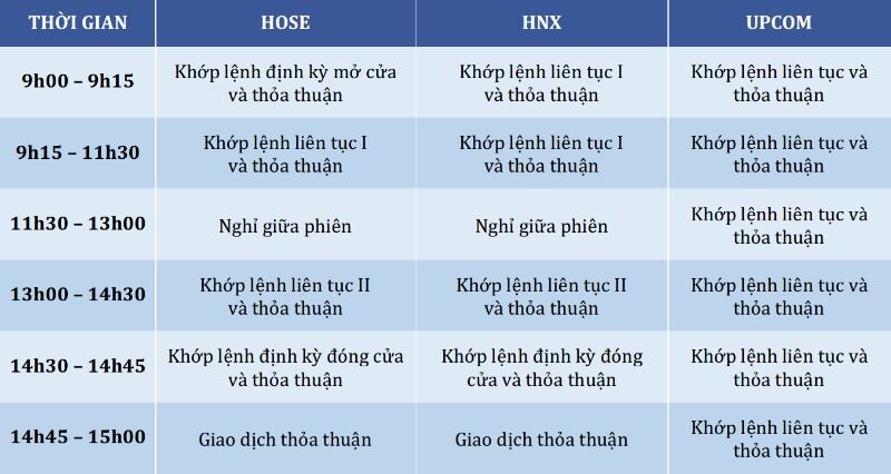 - Sàn HNX: giao dịch bắt đầu từ 9h00 đến 11h30, chiều từ 13h00 và kết thúc 14h30.